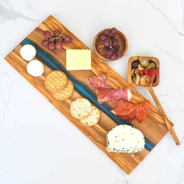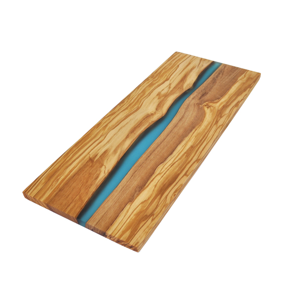 The olive wood board has a river of blue resin cutting through the middle.  The resin allows you to see the natural edging of the olive wood through the middle of the board.