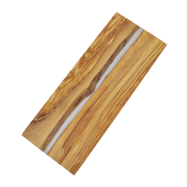 The olive wood board has a river of clear resin cutting through the middle.  The resin allows you to see the natural edging of the olive wood through the middle of the board.